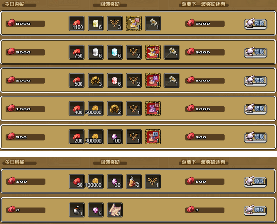 6、单日充值满 100血钻,即可获得:血钻×50,金币×100000,荣誉碎片×30,神力矿工包×2,冒险徽章×1