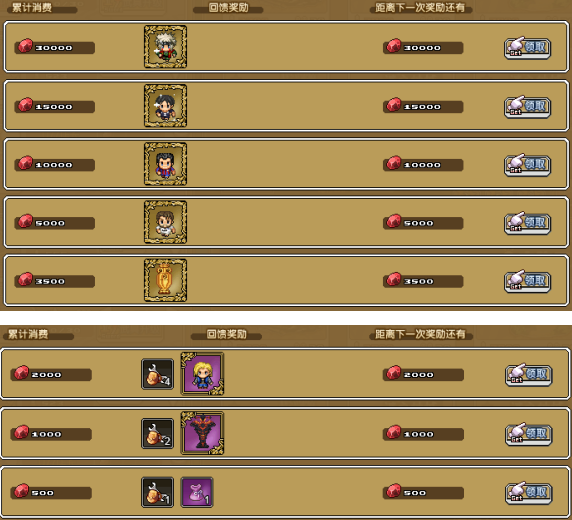 3、单日充值满2000血钻,即可获得:血钻×500,赤魂晶×6,猛斗英雄礼包×1,巨魔雕像×3,冒险徽章×2,高级锻造锤×1
