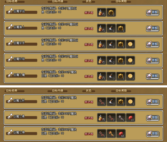 3、击杀巨魔30次,可获得:神力矿工包×1,雷管×1,巨魔雕像×1,挖矿徽章×1)