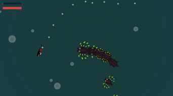 WASD=控制移动,鼠标操作=瞄准射击,潜入水中引出的怪鱼,界面左上角,红色槽是生命值,蓝色槽是经验值,经验满后,可对技能和装备进行些许的提升。